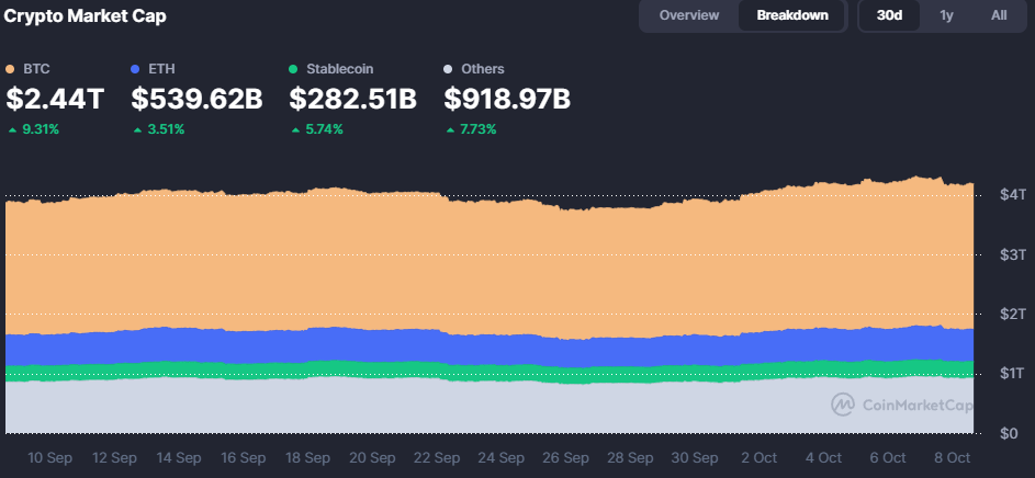 Celková tržní kapitalizace kryptoměn dle CoinMarketCapu dosáhla k 8. říjnu 2025 hodnoty 4,18 bilionu dolarů.