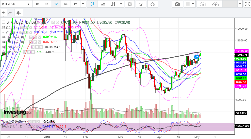 Investiční banka Goldman´s plánuje obchodovat BTC a ten nám skokově vyráží nahoru. Před sebou máme silnou psyhologickou hranici 10 000 USD, SMA 200 a řadu technických resistancí. Z Daily pohledu se začínají narovnávat i ostatní silné klouzavé průměry (50, 34) a bullish nálada na trhu je znát.