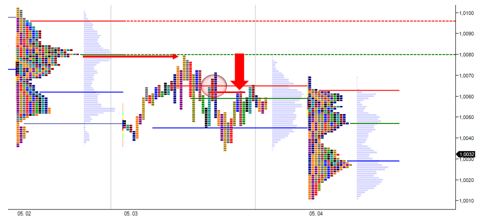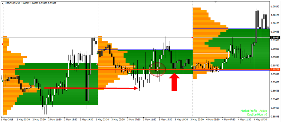 Jedním ze zasažených PWFT levelů byl ten na měnovém páru USDCHF. Level vycházel ze zakroužkované oblasti, kde trh došel na denní POC, cena silně odmítla nižší cenu dole (pivot low) a zavřela nad. Extra silný signál v podání pivotové low, ze které se vytvoří 123Gap. Nebylo příliš obtížné hledat možný long level v této oblasti z nižšího časového rámce.