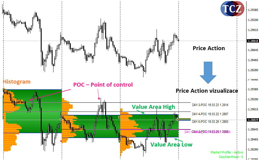 Market Profile v sobě nese hned několik jednotlivých ukazatelů, které do sebe zapadají tak dokonale, až vytváří právě profil sledovaného trhu. V přístupu Price Action (PA) se setkáme s vizualizací ceny za určitý čas. K tomu využíváme klasický graf, většinou svíčkový, který nám udává pohyb ceny za určitý čas a jako bonus nám znázorní Open, High, Low a Close.