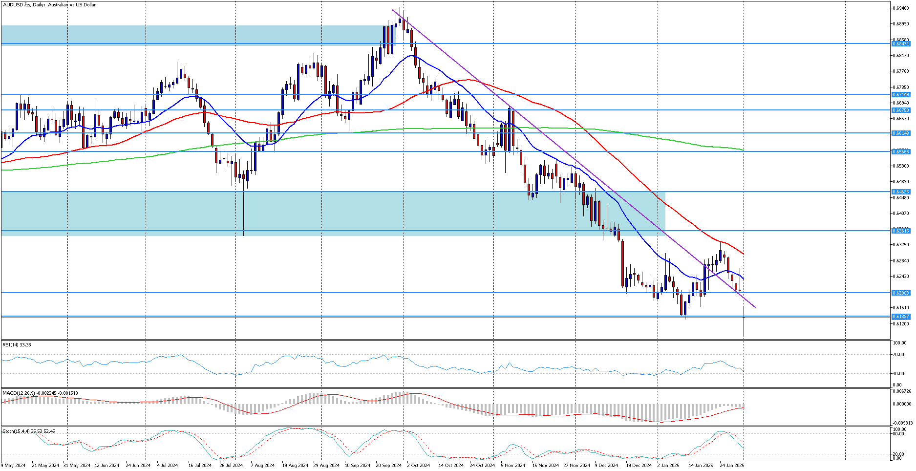 Po čtyřech po sobě jdoucích červených svíčkách, které byly důsledkem jak relativně jestřábího zasedání Fedu, tak slabších australských údajů o inflaci, dnes AUD/USD zaznamenává propad k ceně 0,6138. První pokus medvědů zatlačit AUD/USD pod trendovou linii z 30. září 2024 selhal, což vyvolalo malý odraz vzhůru. Jak již bylo řečeno, klesající trend z maxima z 30. září 2024 zůstává v platnosti, a to i přes nedávné obchodování v rozpětí. Ukazatele momenta jsou v tuto chvíli nerozhodné. Konkrétně index ADX (Average Directional Movement Index) se pohybuje do strany, pod svým středem, což signalizuje, že trh na páru AUD/USD je bez trendu. Mezitím se ukazatel RSI pohybuje kolem svého středního bodu 50. A co je ještě důležitější, stochastický oscilátor klesl pod svou překoupenou oblast a téměř vertikálně se posouvá směrem dolů a vytváří mezeru od svého klouzavého průměru. Medvědi by se mohli pokusit využít tohoto medvědího pohybu stochastického oscilátoru, ale je třeba potvrzení z cenové akce AUD/USD. Kdyby medvědi zůstali hladoví, mohli by se pokusit znovu otestovat klíčovou oblast supportu pravděpodobně nacházela na úrovni 0,6138. Jestli se cena neudrží trh by se mohl podívat až na úroveň 0,6000. Na druhé straně by býci pravděpodobně rádi navázali na dnešní zelenou svíčku a zopakovali rally směrem k minimu z 3. listopadu 2022 na úrovni 0,6271. Výše by býci na AUD/USD mohli mít šanci zaznamenat vyšší maximum za předpokladu, že se jim podaří překonat 50denní jednoduchý klouzavý průměr (SMA) a minima z 6. září 2023 na úrovni 0,6308, resp. 0,6356.