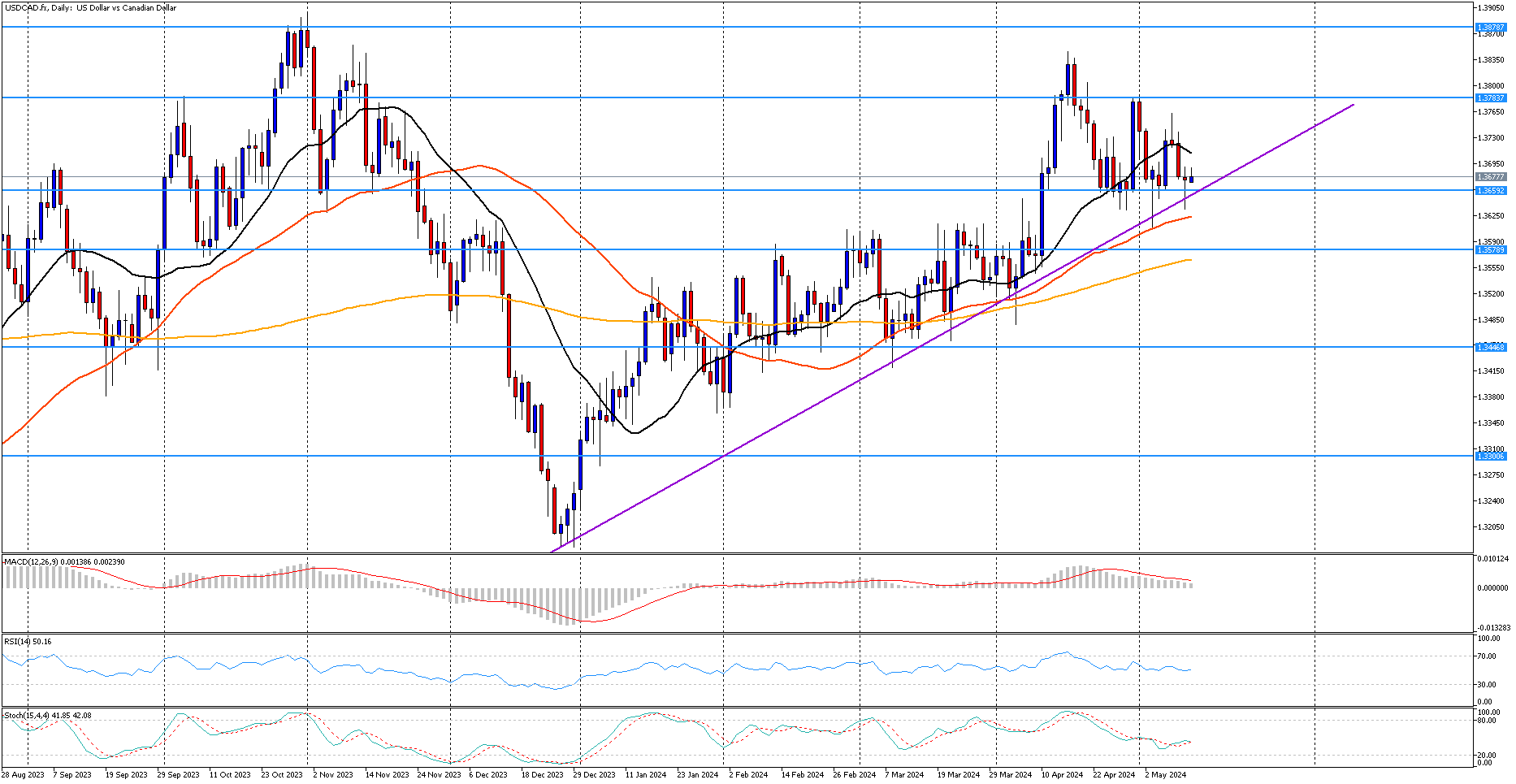 USD/CAD se propadá pod 20denní jednoduchý klouzavý průměr (SMA) a blíží se ke střednědobé vzestupné trendové linii v oblasti podpory 1,3630-1,3610.