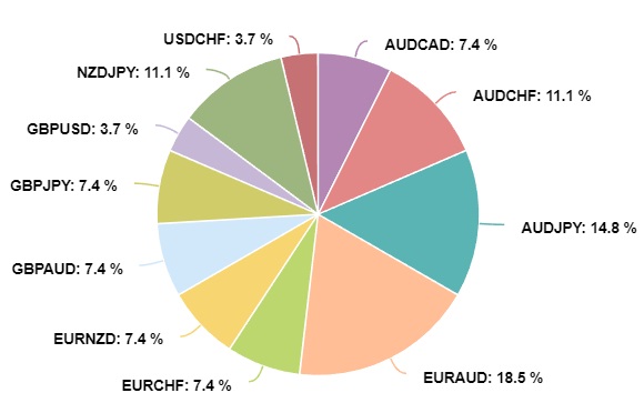 Našich lednových 24 obchodů bylo realizováno celkem na 11 obchodních instrumentech. Největší podíl v tomto portfoliu zastupuje měnový pár EUR/AUD, na kterém jsme obchodovali jednou ve směru long a jednou ve směru short. V lednu nám trh nabídl pouze jednu obchodní příležitost na hlavním měnovém páru, a to na USD/CHF. Zbytek obchodních instrumentů tvořily především swingy na crossových měnových párech.