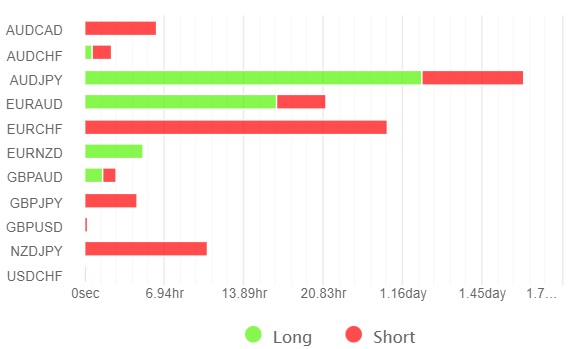 Za povšimnutí určitě stojí i délka držených otevřených pozic, která se u některých instrumentů výrazně zvedla, což je opět zásluha nové obchodní strategie, při které s delším držením obchodní pozice počítáme. Nejdelší obchod probíhal na měnovém páru AUD/JPY, a to cca 30 hodin. Více jak jeden den jsme si museli počkat i na realizaci zisku na EUR/CHF. Ostatní obchody trvaly kratší čas, protože v rámci MP strategie obchodujeme pouze první dotek našeho levelu a v případě konsolidace trhu na levelu obchod aktivně řídíme.