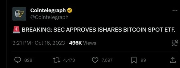 Největší, relativně důvěryhodný zdroj informací o světě kryptoměn – Cointelegraph – sdílel na svém X profilu s 1,9 milionu sledujících oznámení toho, že došlo ke schválení prvního obchodovatelného spotového BTC fondu. Co následovalo, byl raketový růst ceny největší kryptoměny. Než se ukázalo, že k ničemu takovému nedošlo.