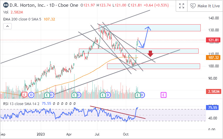 Po odrazu z oblasti supportu na 100,00 USD zažívají akcie DR Horton Inc. v polovině listopadu agresivní růst o více než 17 %. Dne 3. listopadu 2023 cena opustila sestupný kanál, což by mohlo signalizovat konec medvědí korekce.