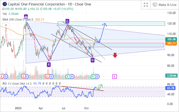Cena Capital One Financial Corp. byla od 3. února 2023 stlačena v rámci formujícího se trojúhelníku s horní hranicí na 117,50 USD a spodní na 87,00 USD. Dne 31. října 2023 se  hodnoty RSI ustálili nad klesající trendovou linií, což by mohlo signalizovat potenciální růst ceny k horní hranici vzorce trojúhelníku.
