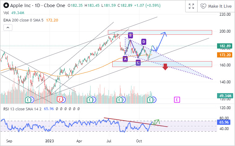 V polovině listopadu se akcie společnosti Apple Inc. (NYSE: AAPL) pokusily vymanit ze obratového vzorce Wedge. Od 18. srpna 2023 byly stlačeny v rámci tohoto tvořícího se vzorce. Konsolidace nad horní hranicí vzorce může naznačovat, že korekce směrem dolů by mohla skončit a cena dále růst.
