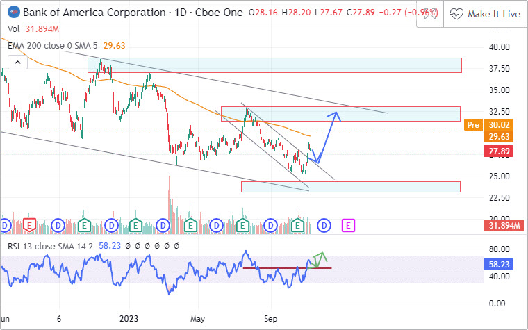 Dne 3. listopadu 2023 cena akcií Bank of America Corporation (NYSE: BAC) opustila sestupný kanál a ustálila se nad horní hranicí obratového vzorce Dvojité dno. Lze předpokládat, že cílem růstu v rámci formujícího se obratového patternu může být úroveň 32,00 USD.