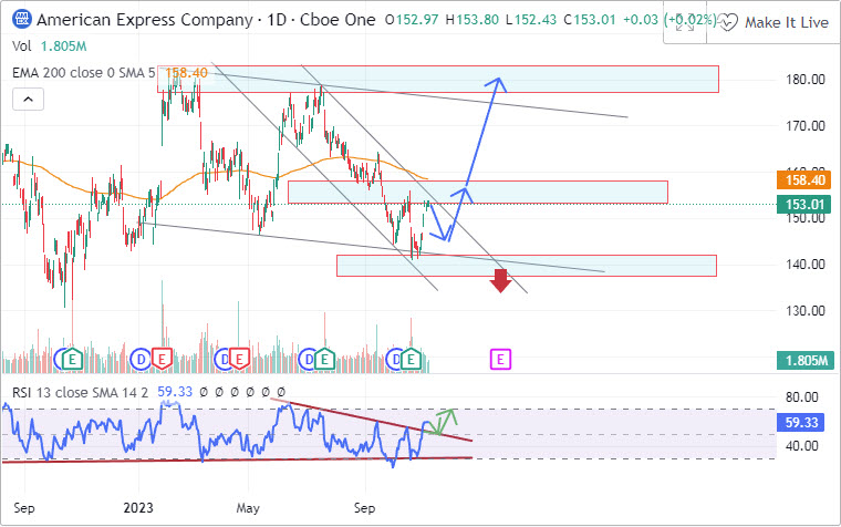 Cena akcií společnosti American Express (NYSE: AXP) se 30. října 2023 odrazila v oblasti supportu okolo 140,00 USD. V polovině listopadu se cena přiblížila k nejvýznamnější úrovni rezistence. Pokud ji překoná, mohla by opustit korekční kanál. Za takových podmínek bude růstový cíl pro kupující pravděpodobně na úrovni 180,00 USD.