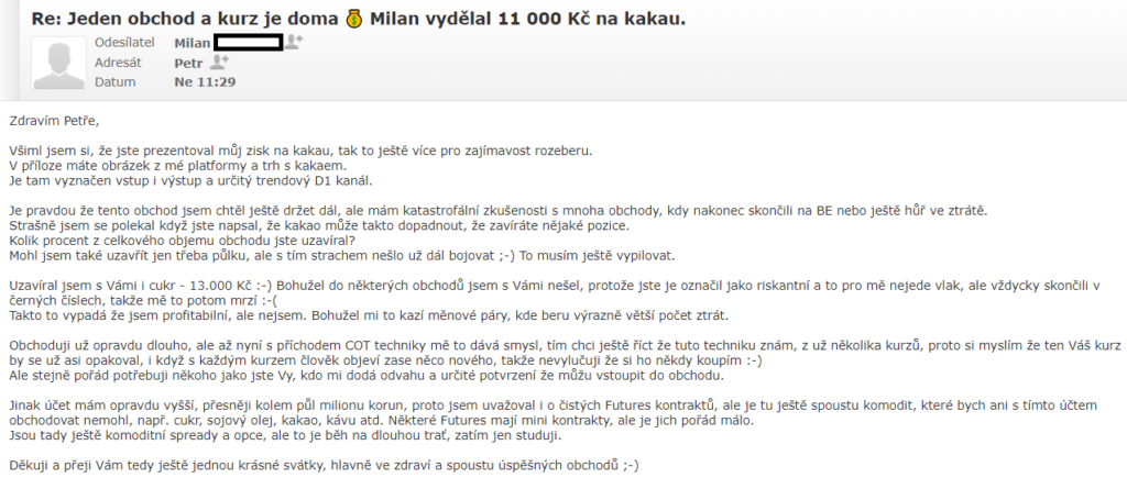 Níže naleznete autentický e-mail doplněný printscreenem z reálné obchodní platformy. Věřím, že nikdo o výdělku tradera Milana nepochyboval, ale tedy je to černé na bílém.