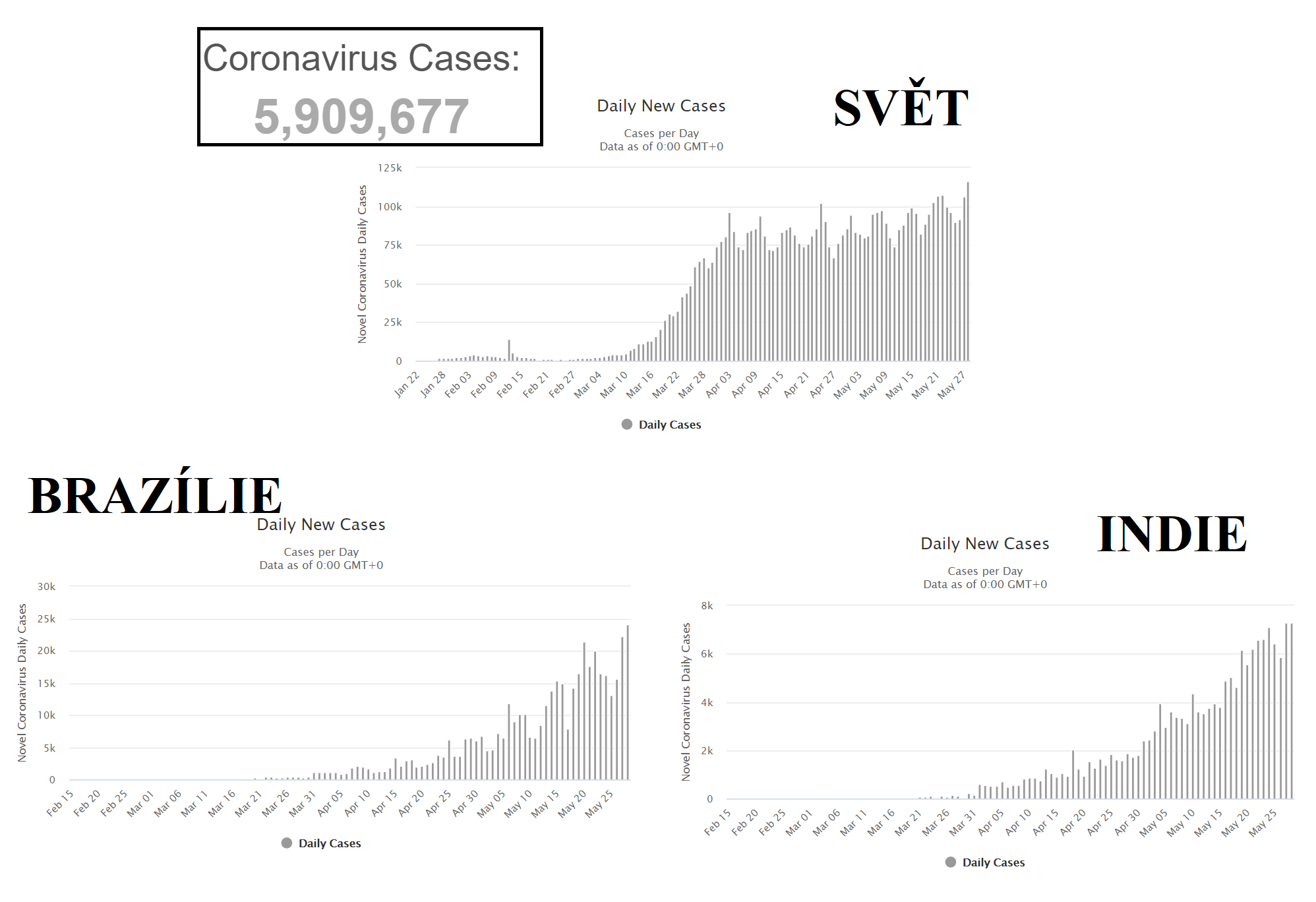 Počty nově nakažených však nerostou v Asii, v Evropě, ani v USA (drží se kolem 20 000 za den), ale v Latinské Americe, nebo v Indii a v Afrických zemích.