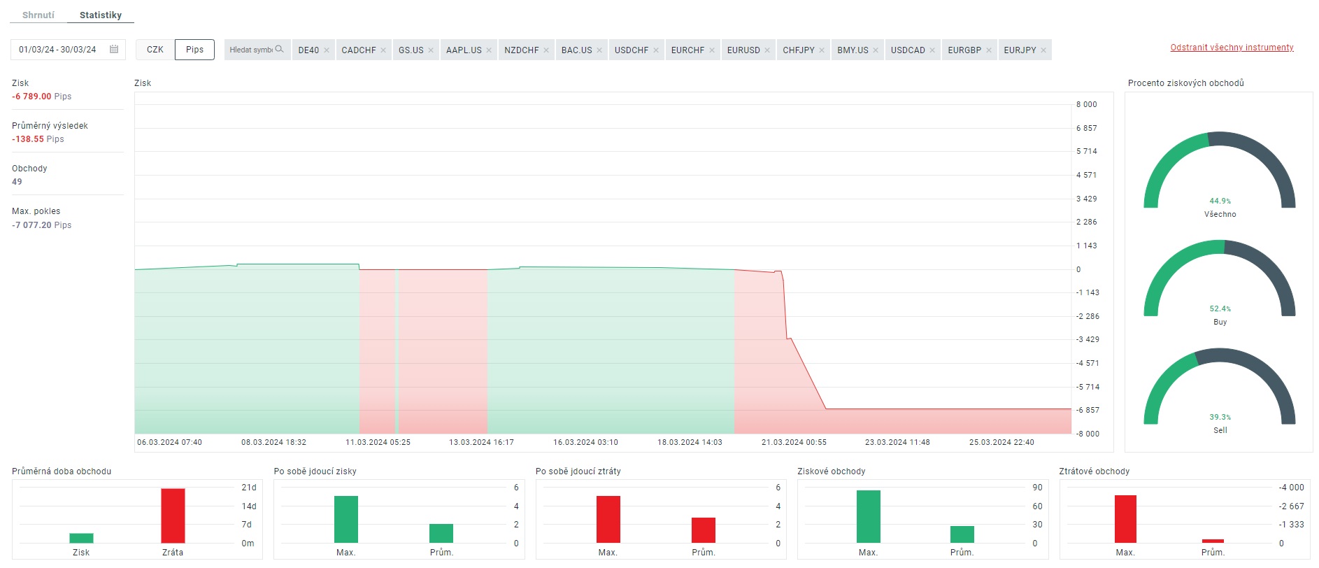 Obchodování na platformě xStation bylo v březnu ztrátové. Výraznější kapitálový propad proběhl kvůli ukončení tří obchodů na akciích. Tato ztráta byla sice redukována, ale i tak se jednalo o stop lossy.