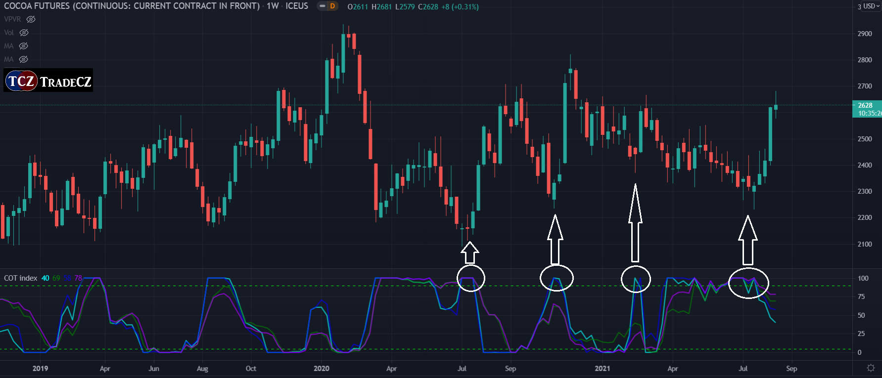 V grafu od TradingView je patrné, co mě pro long obchod na kakau přesvědčilo. COT index byl již dlouhou dobu vyhrocen jasně na long, přičemž cena kakaa se dál propadala. Téměř vždy, když k této situaci došlo, našel trh své cenové dno.