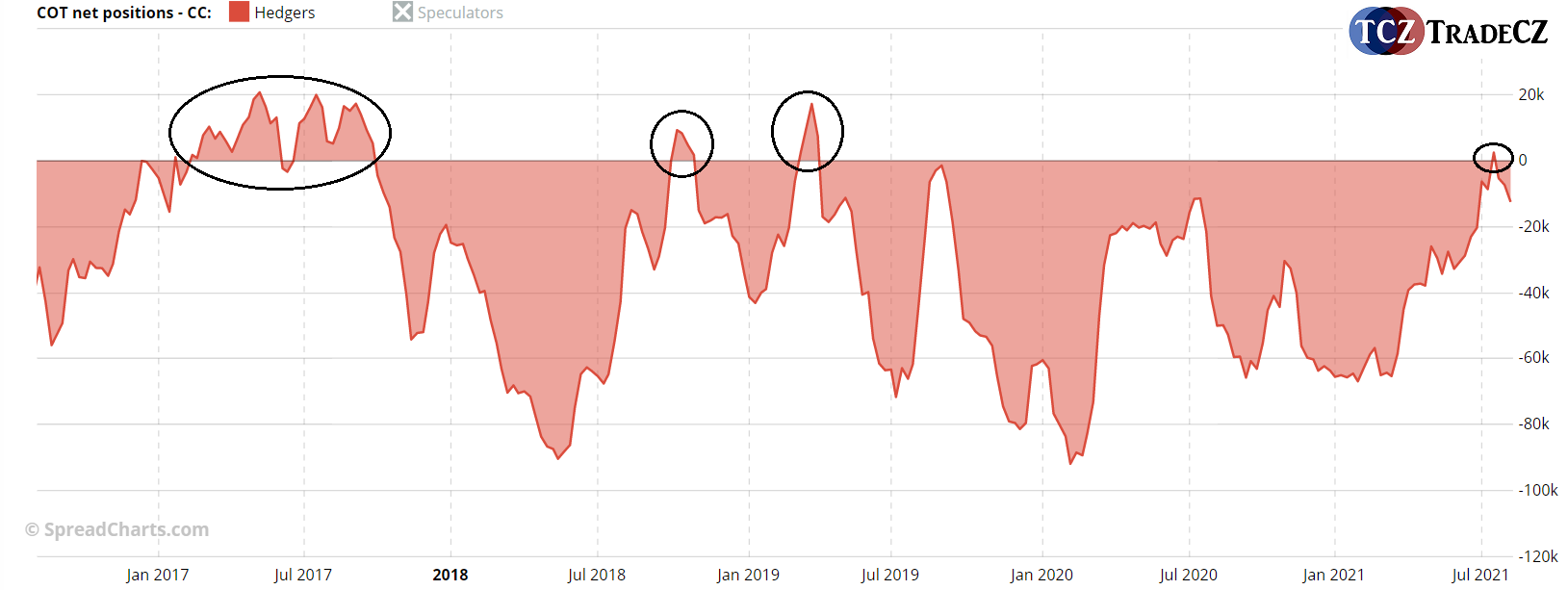 Velcí spekulanti (Large Traders) se v té době nacházeli tzv. net short cca 20 000 kontraktů. Při analýze sentimentu pomocí pozic velkých spekulantů nám nečekaně může pomoct také základní technická analýza. Při pohledu na graf vývoje čistých pozic si nelze nevšimnout čím dál rychlejších obratů net short pozic, které jako by nám chtěly říct, že na těchto cenách je již kakao příliš podhodnocené.