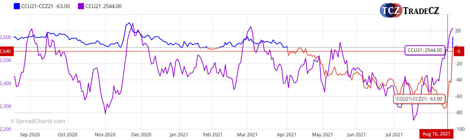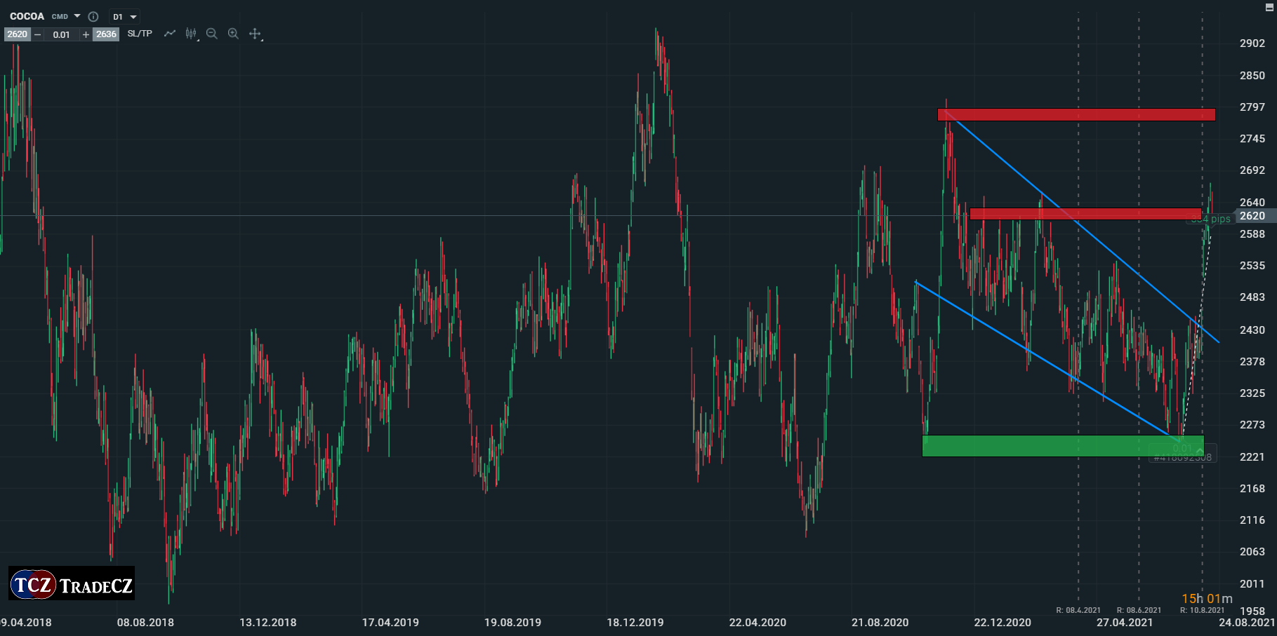Kakao se již čtyři roky pohybuje v cenové range mezi 1 800 a 2 800 USD za tunu. Dne 20. 7. 2021 se cena za tunu kakaa pohybovala na nejnižších úrovních za poslední rok, v době, kdy u většiny ostatních komodit (softies či zrnin) vidíme rostoucí trend.