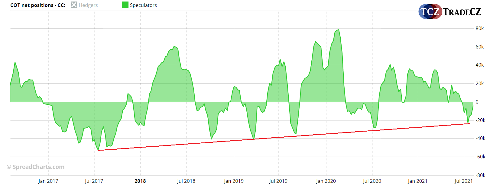 Z technického hlediska jsme se dostali na spodní trendovou linii z formace klesající trendový kanál, a jelikož je obecně na komoditách dobrá nálada, bylo na čase se na kakao blíže podívat pomocí Techniky COT.