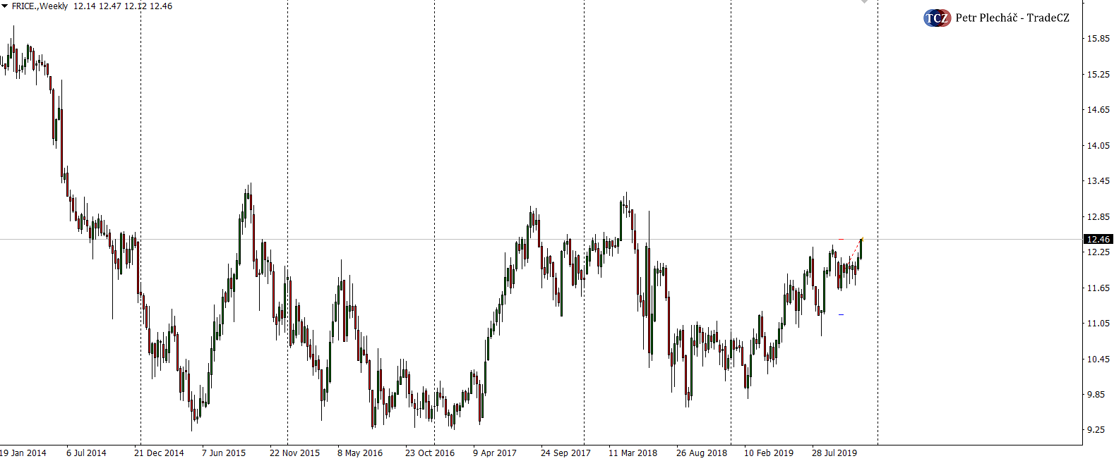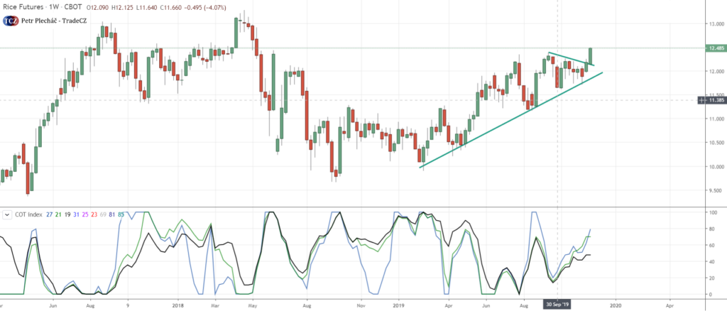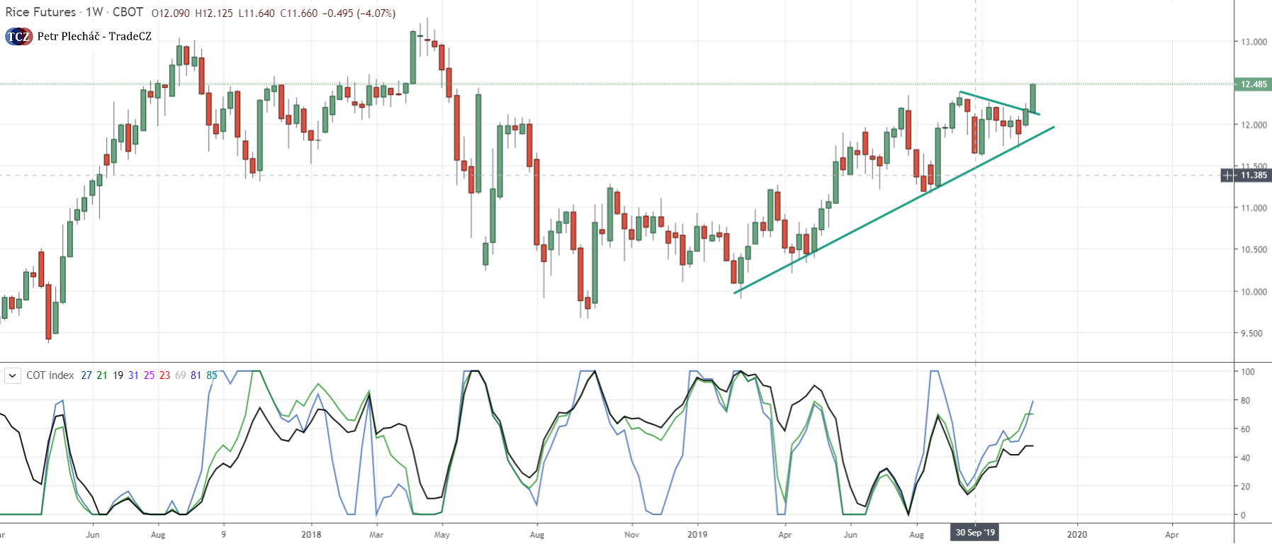 Rýže se z dlouhodobého hlediska nachází na horním okraji asi pětileté rotace trhu. Přirozeně bylo na místě hledat signály do shortu. COT index byl na nižších hodnotách, ale nebyl vyhrocen. Commercials tedy prodávali, ale nikterak přehnaně. Trh také krásně respektuje růstovou trendline, od které se odrazil, a v posledním týdnu dokonce prorazil formaci triangle směrem vzhůru. Nyní má rýže prostor posílit až k horní resistenci, kde bude možné opět vyhledávat příležitosti do shortu.