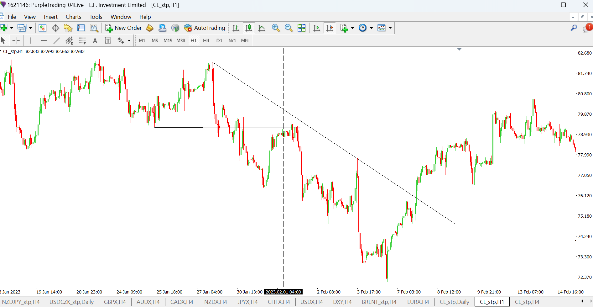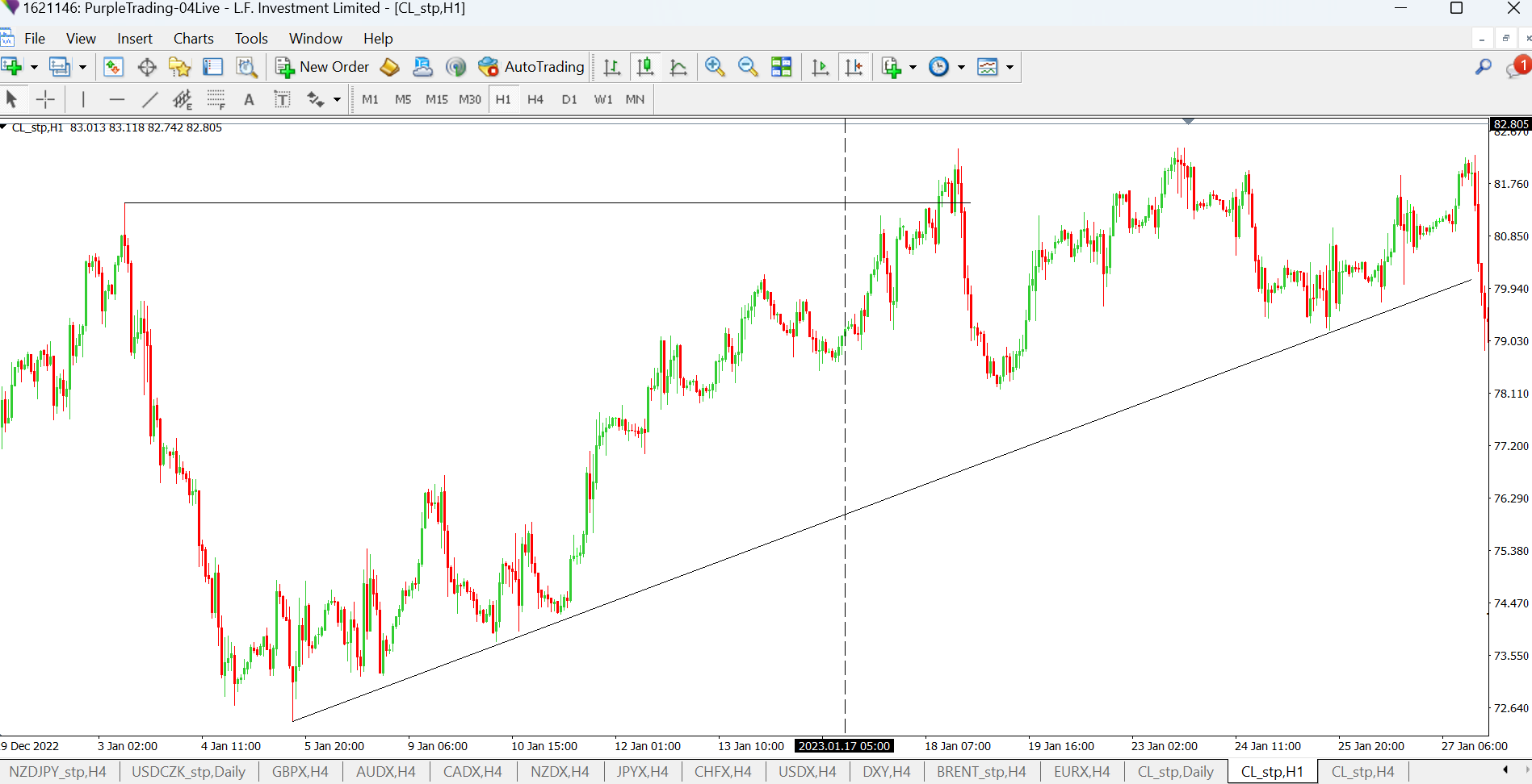 Dne 17. 1. 2023 reportovala Čína HDP 2,9 %, které bylo lepší než očekávání analytiků. Tato hodnota byla pro ropu býčím signálem a cena pokračovala dále v rostoucím trendu k nejbližší hladině rezistence.
