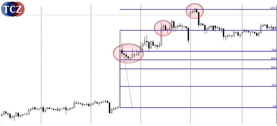 První situaci, kterou si musíme pohlídat, je zavření dlouhé svíce. To, že fibo natahujeme na high/low jsme si všimli. Pokud dlouhá svíce zavře nad hodnotou 72.8 – stává se z tohoto levelu support a my hrajeme na odraz a pokračování v pohybu (v tomto případě do longu).