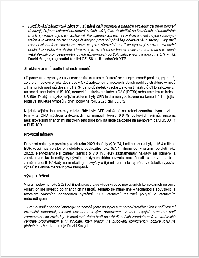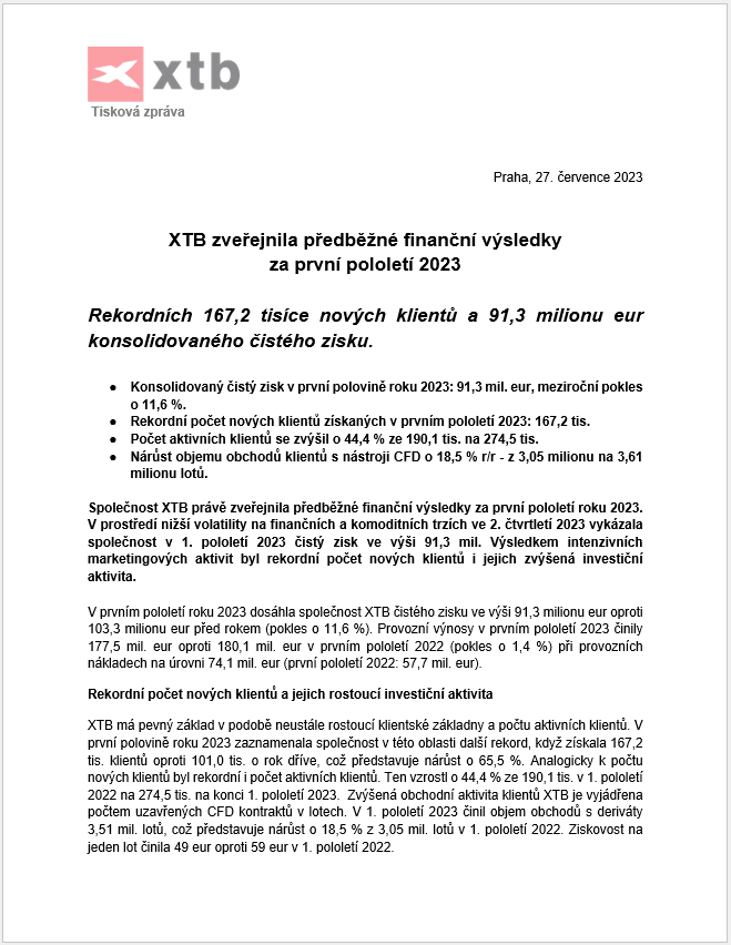 Předběžné finanční výsledky XTB za první pololetí 2023