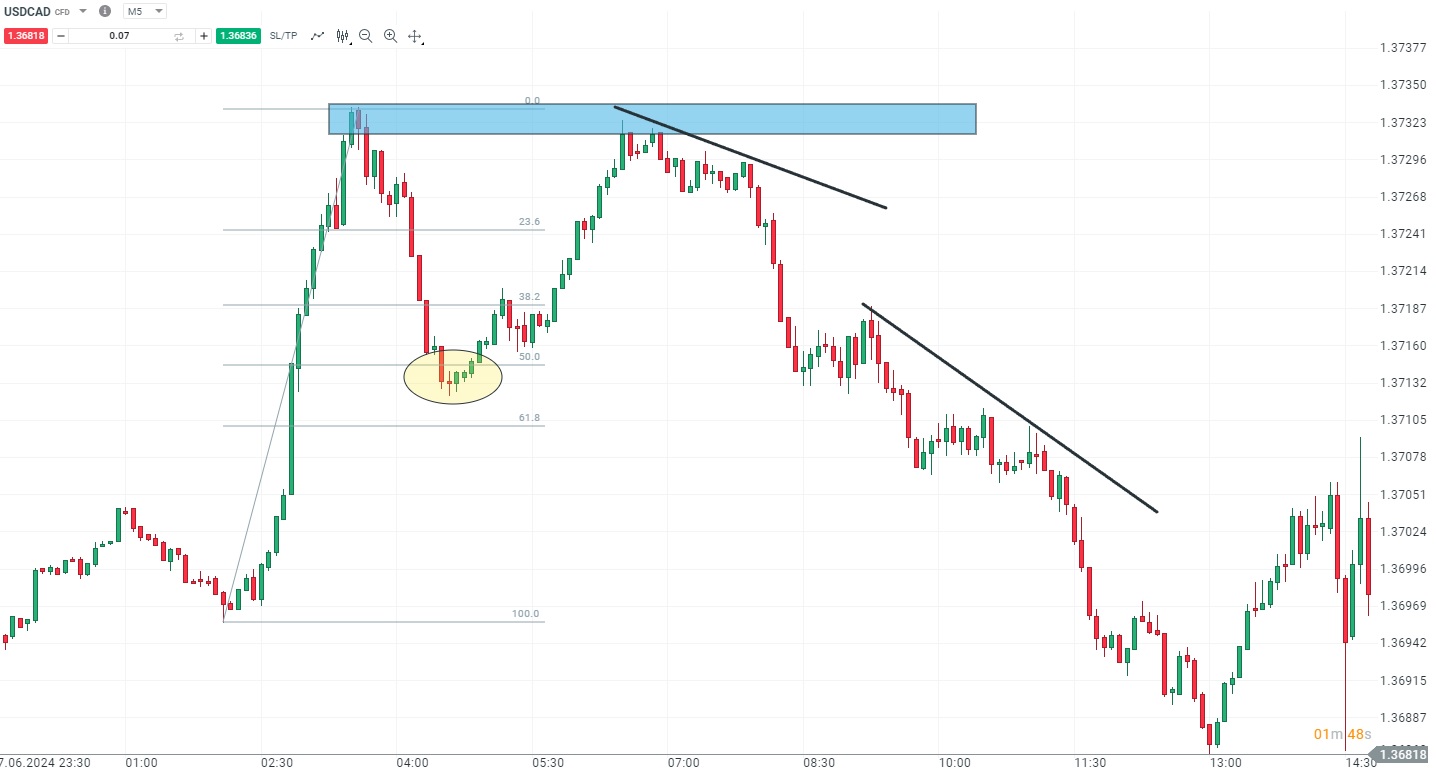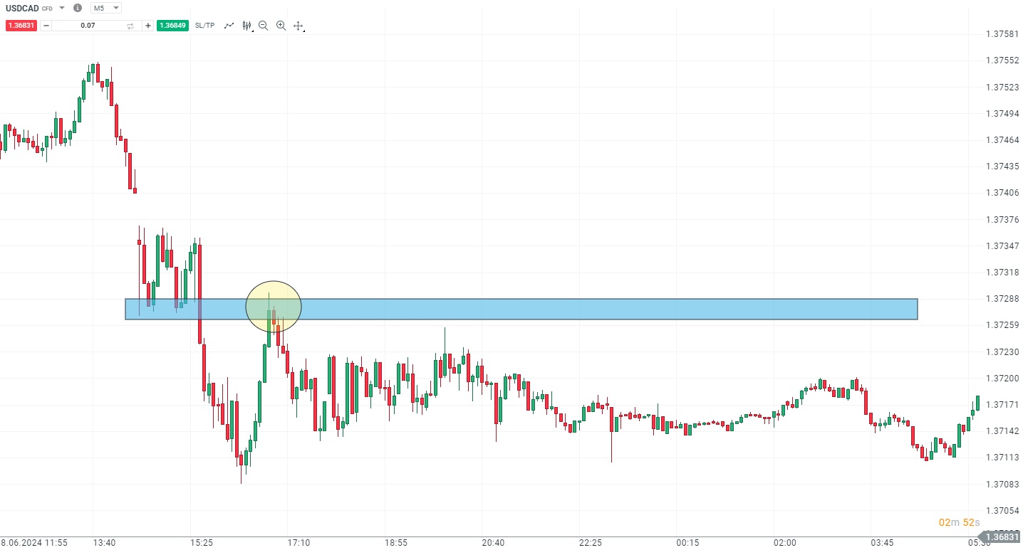 V tomto článku se zaměříme na měnový pár USD/CAD, a to konkrétně na M5 časový rámec, kde si popíšeme několik obchodních myšlenek a patternů, které se na finančních trzích neustále opakují, a proto se vyplatí je umět identifikovat. Hned první ukázka nás zavede do technické analýzy, díky které jsme do určité míry schopni predikovat budoucí cenové pohyby.