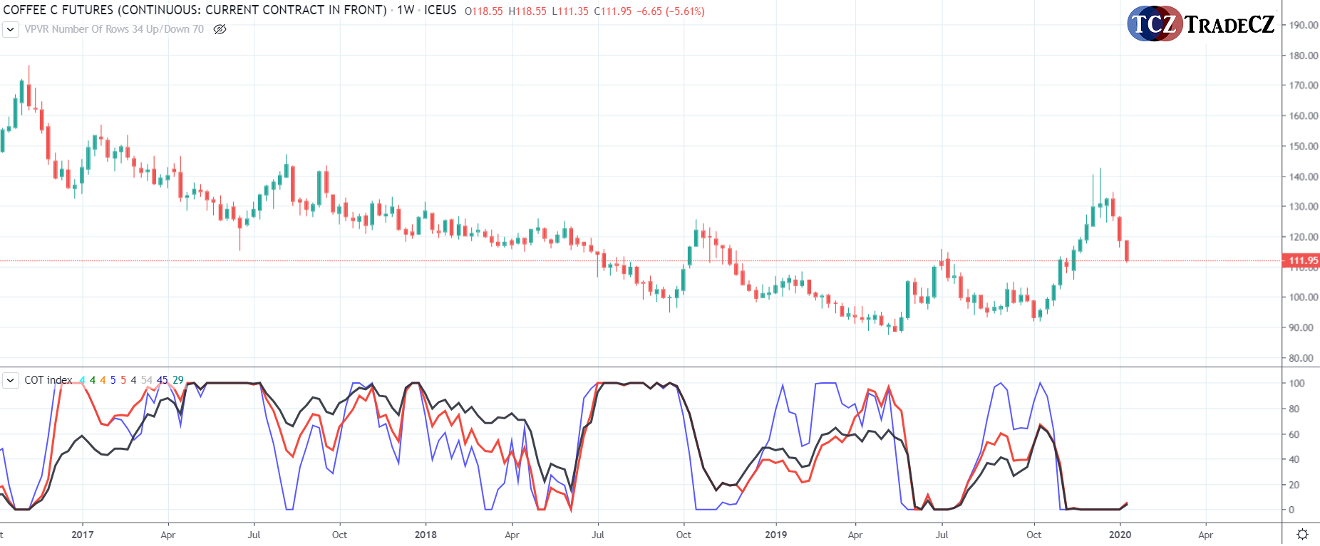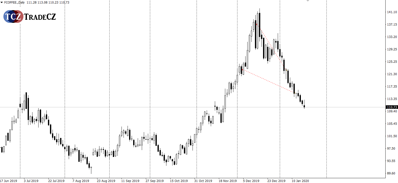 Káva je dlouhodobě v silném sestupném trendu a nákupy přichází v úvahu pouze při splnění věškerých podmínek a s uvědoměním si vyšího rizika vstupu do longu.