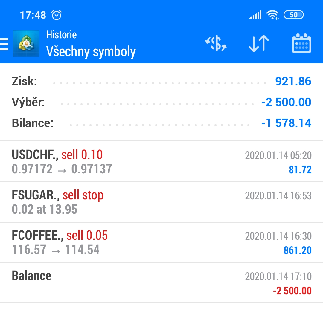 Tomáš zavřel rychlý profit 861 Kč, když kávu shortoval z 116.57 na 114.54.