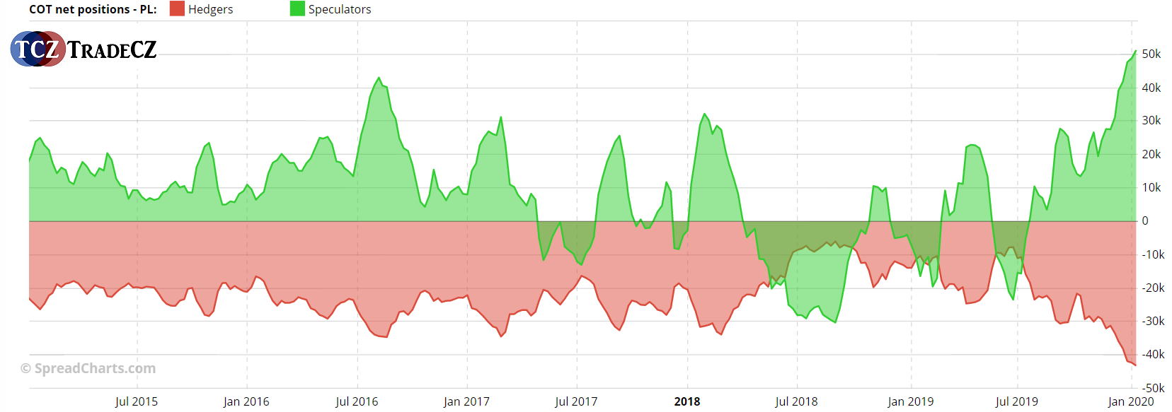 Co stálo za tím, že jsme v PWFT klubu zvažovali short tohoto drahého a průmyslového kovu, najdete na obrázku výše. Na něm můžete vidět ty nepřehlédnutelné rozevírající se nůžky, tvořené velkými spekulanty spolu s hedgers. Ti jsou na extrému, ze kterého dříve nebo později dojde ke korekci trhu.