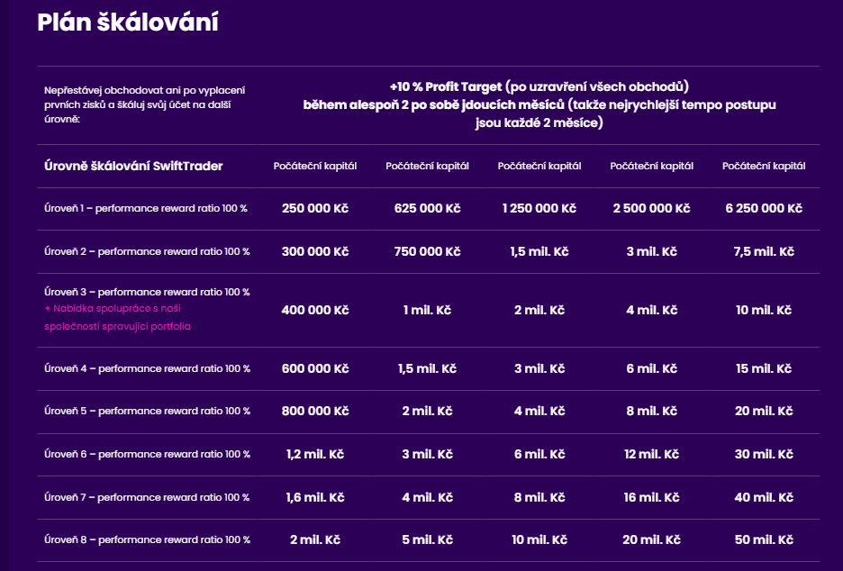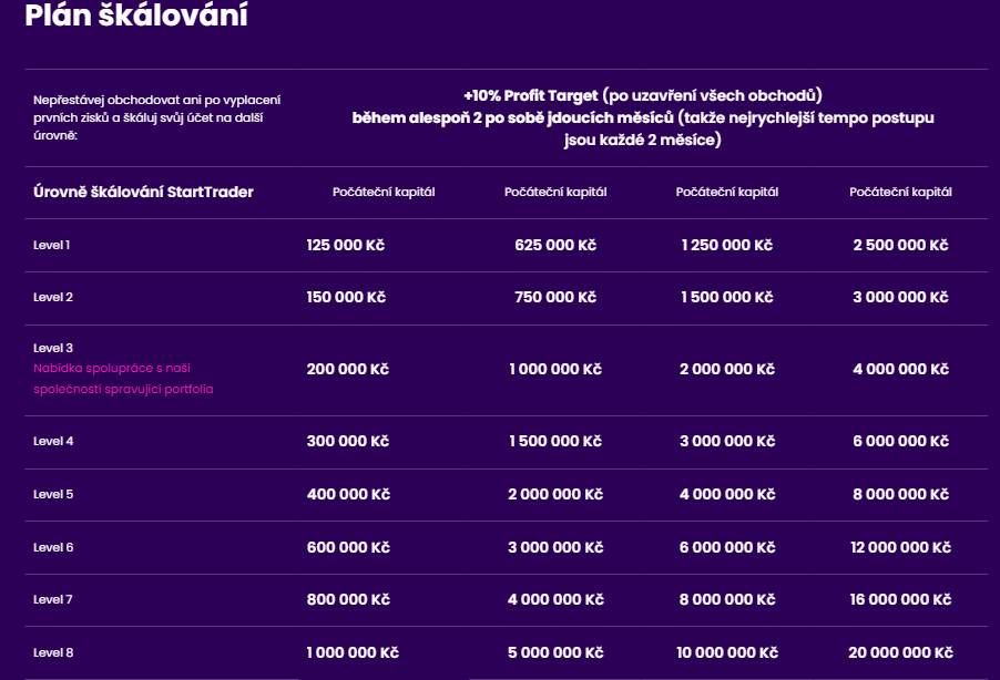 Pokud budete plnit 10% zhodnocení během alespoň 2 po sobě jdoucích měsíců, budete mít nárok na scaling plán a váš účet bude postupně růst na velice zajímavé částky.