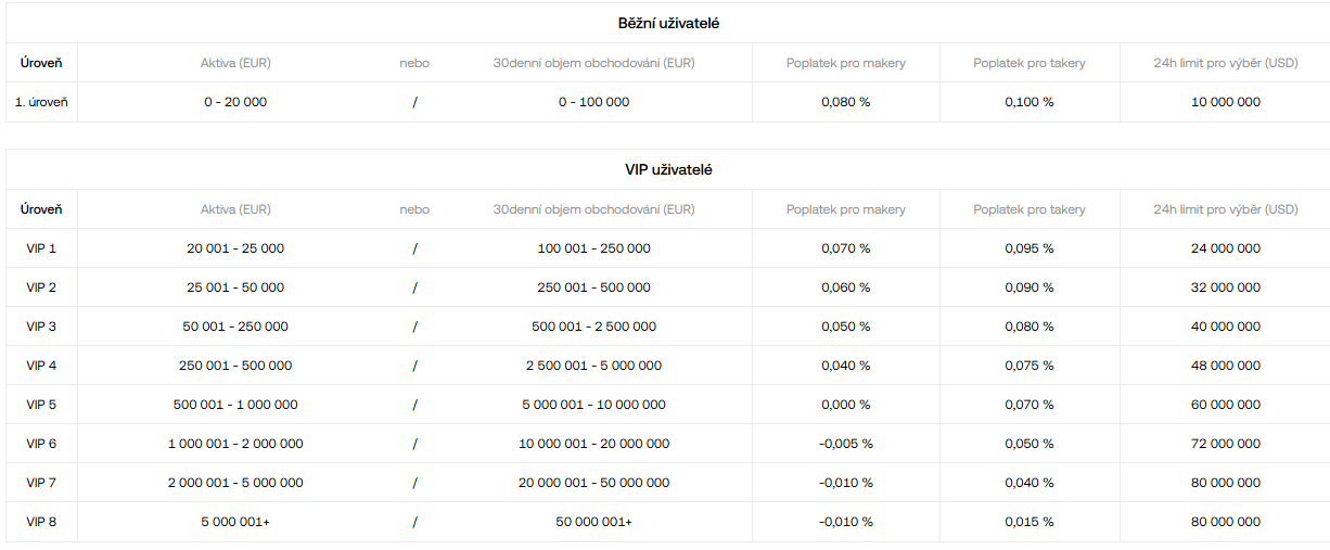 Burza OKX uplatňuje diferencovanou poplatkovou strukturu, která závisí na úrovni uživatelů. Tato úroveň se stanovuje na základě objemu obchodování za posledních 30 dní a celkové hodnoty aktiv pod správou. Aktualizace poplatkové kategorie probíhá denně, čímž je zajištěna dynamická optimalizace podmínek pro obchodníky.