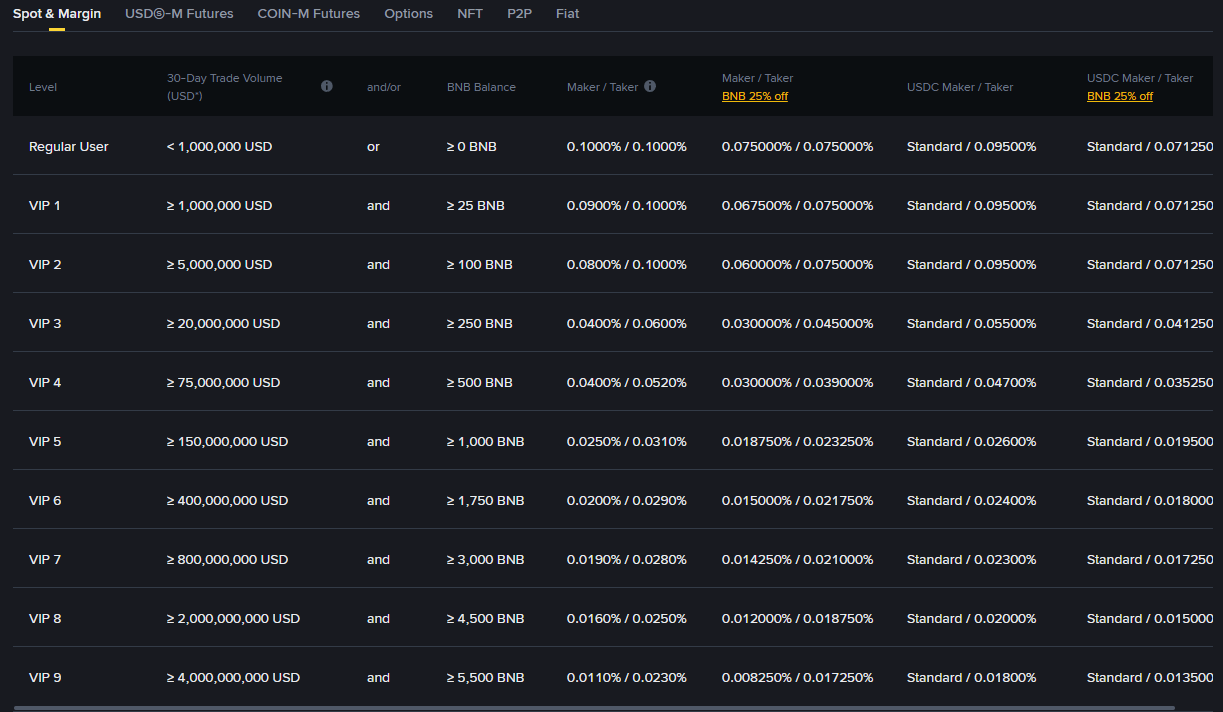 Jak je patrné z poplatkové struktury, výše poplatků na burze Binance závisí především na měsíčním objemu obchodování a množství kryptoměny BNB, kterou uživatel drží. Čím větší objem obchodů uživatel uskuteční a čím více BNB vlastní, tím nižší poplatky za obchodování platí.