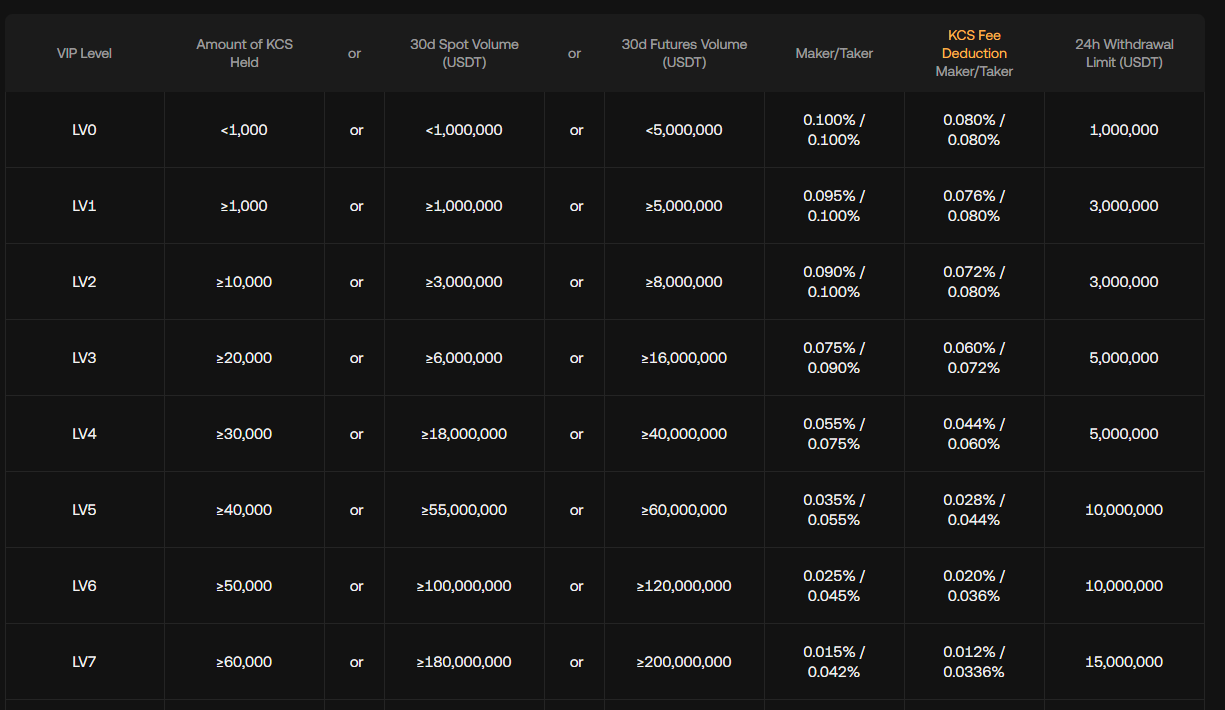 Burza KuCoin nabízí systém VIP úrovní, který odměňuje aktivní uživatele lepšími podmínkami pro obchodování. Každý uživatel může získat vyšší úroveň buď držením vlastních tokenů KuCoin Shares (KCS), nebo dosažením určitého objemu obchodů.