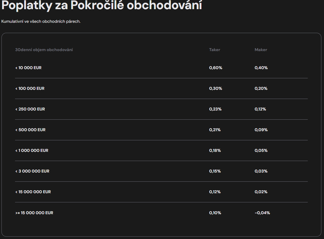 V přehledné tabulce jsou uvedeny poplatky podle měsíčního objemu obchodů a rozlišení mezi tzv. Makerem (dodavatel likvidity) a Takerem (odběratel likvidity), přičemž výhodnější podmínky mají uživatelé, kteří likviditu na trh přidávají.
