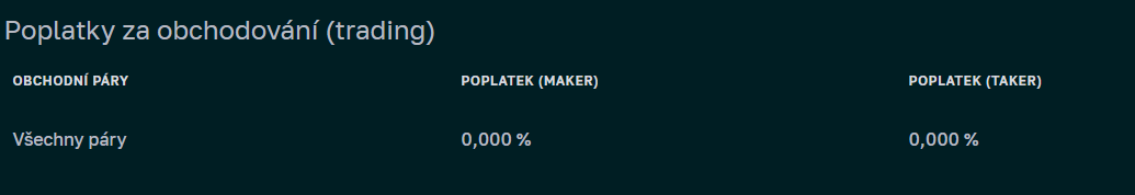 Vklady v českých korunách i většiny kryptoměn jsou zcela bez poplatků, stejně jako výběry v korunách, zatímco u kryptoměn je účtován poplatek podle konkrétní kryptoměny.
