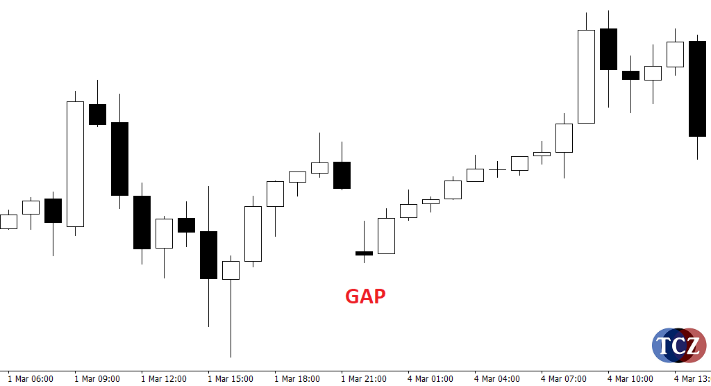 Na obrázku výše je zobrazen fyzický gap, tedy mezera v grafu, která vznikla otevřením svíčky na jiné ceně, než na které předchozí svíčka zavřela.