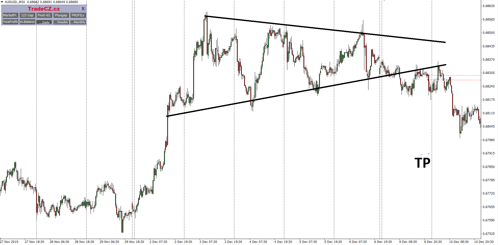 Měnový pár je v dlouhodobém silném downtrendu a průraz trianglu do shortu se zdál být dobrým settupem. Trh se proti nám příliš nepohyboval a z plánovaných 37 pipů profitu došel dokonce až na 29 pipů.