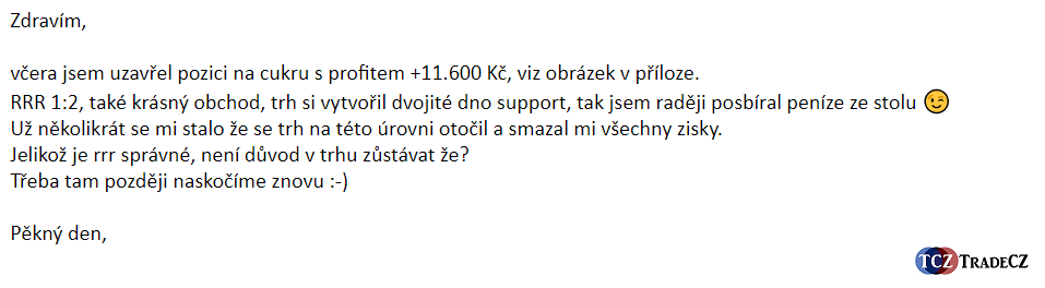 Na obrázku výše je samotný záznam z reálného obchodu na cukru. Short byl načasován na pullback trhu k překonané rostoucí trendline a profit stanoven na silnou supportní úroveň, kde to trh v minulosti otočil zpět do longu.