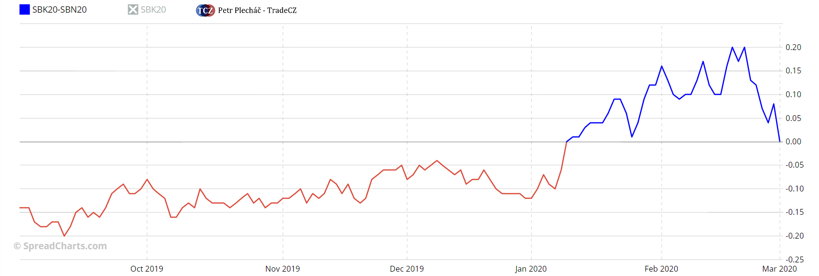 Poptávka byla tím ukazatelem, který nás držel delší dobu mimo trh. Od ledna poptávka po cukru ustavičně rostla a zakazovala nám vstup do obchodu. Poptávku získáme porovnáváním vybraných futures kontraktů, které nám dokáží vizualizovat zájem obchodníků.
