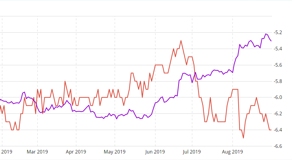 Na obrázku výše je fialovou křivkou znázorněn cenový vývoj zlata od února 2019, červenou křivkou je znázorněn bull spread na zlato, který nám vytváří reálnou poptávku po zlatu. Jak je vidno, realita je možná někde úplně jinde a cena zlata neodpovídá opravdovému zájmu investorů.