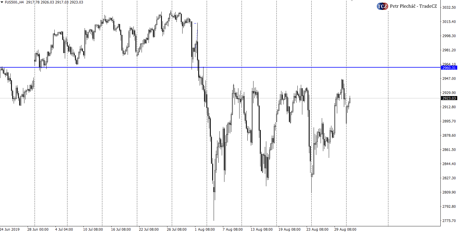Na americkém akciovém indexu SP500 jsme byli ráno svědky otevření s gapem down, který byl během dopoledne kompletně uzavřen. Na index měly pravděpodobně vliv demonstrace v Hongkongu a platnost nových cel od 1. 9. 2019.