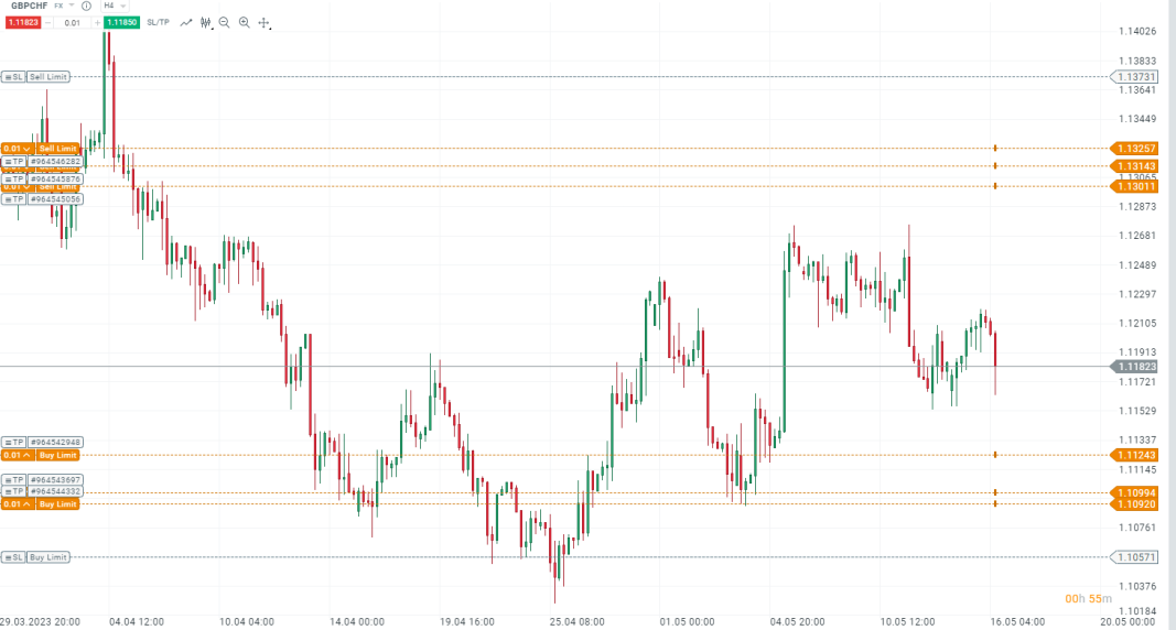 Na obrázku níže jsou vyznačeny jednotlivé vstupy do obchodů, které odpovídají úrovním pro výběr likvidity z prvního obrázku. Vzhledem k tomu, že nevíme přesně, kde bude trh reagovat, nemůžeme si dovolit úzký SL. Nicméně se SL budeme aktivně pracovat, abychom případné riziko co možná nejvíce redukovali. Take profity implicitně do trhu nezadáváme, protože obchod bude aktivně řízený, což umožní využít aktuální volatilitu pro maximalizaci zisku.