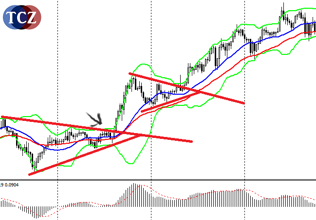 Bollinger Bands (BB) je nástroj užitečný z mnoha ohledů. Tvoří jej 3 linie, kde základní linií je SMA (simple moving average) a další dvě pomocné linie, na každou stranu jedna. V našem příkladě máme prostřední základní linii BB shodnou s MA 21 (ta modrá).