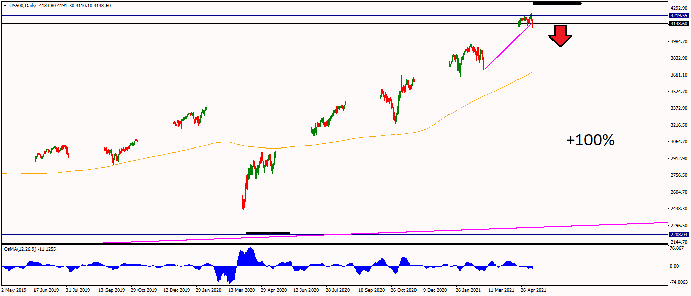 Priemerný ročný výnos S&P 500 je na úrovni 10 %. To je priemerný, čiže sa môže trhu podariť narásť aj o 20 alebo 30 % za rok. Ale za posledný rok aj 2 mesiace S&P narástlo o takmer 100 %! Po takomto skoku to už čoskoro vyzerá na koniec uptrendu, takže shortové pozície čoskoro začnú dávať význam.