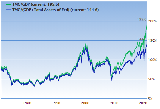 Ide o indikátor TMC/GDP (total market cap/gross domestic product – celková trhová kapitalizácia/hdp). Posledné 2 krízy boli v rokoch 2000 a 2008 a môžete vidieť kde tento indikátor bol. Nad úrovňou 125 znamená, že je trh značne prekúpený a teraz je takmer 200. Najvyššie za posledné desiatky rokov.