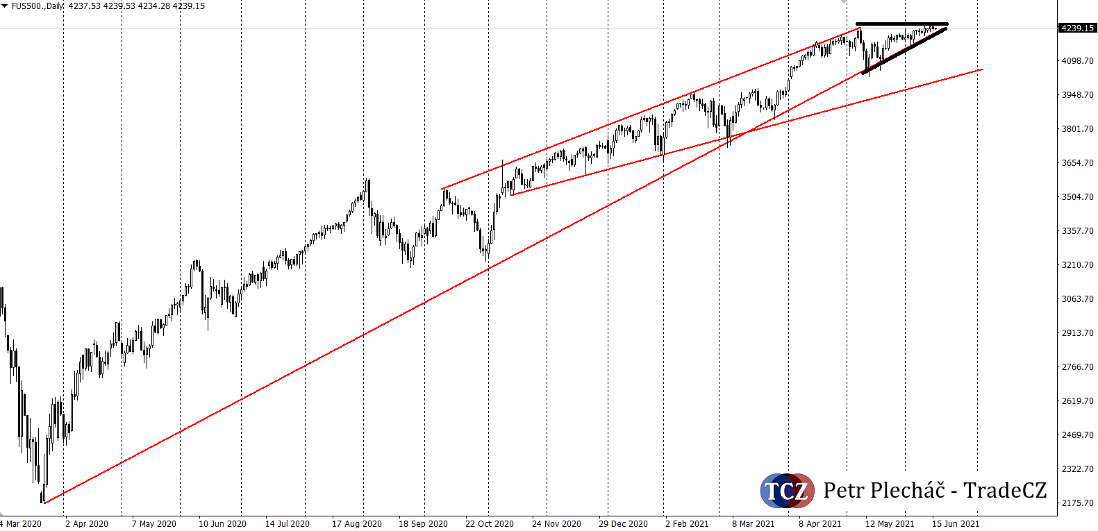 Akciový index SP500 se nachází blízko svých historických maxim, a zároveň na horní i spodní hraně formace triangle! Situace je dle technické analýzy skutečně vyhrocená a můžeme být svědky jak breakoutu výš a pokračování trhu až na 4 500 b., stejně jako korekci dolů s možným příchodem dlouho očekávaného ochlazení sentimentu.