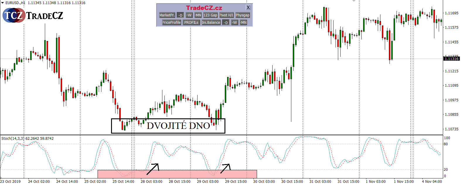 Pro detekci dvojitého dna využívají obchodníci většinou také různé indikátory a oscilátory. Jedním z nich je Stochastic oscillator, který nás informuje o překoupenosti a přeprodanosti trhu.