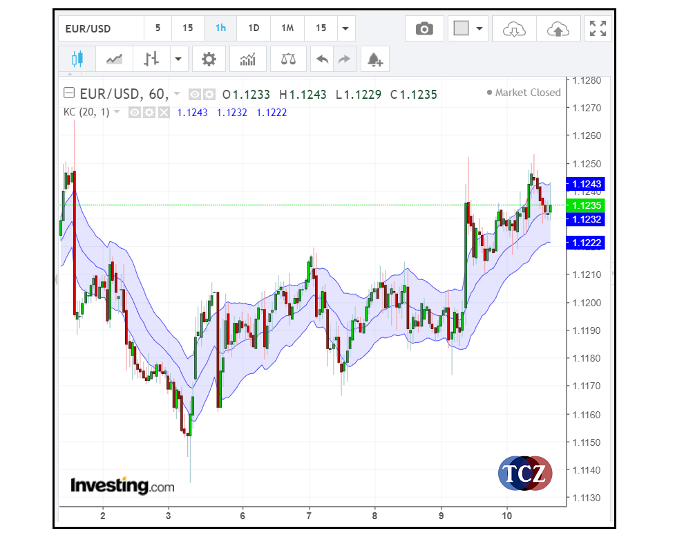 Keltnerovy kanály jsou v grafu vizualizovány jako tři křivky. Složeny jsou z exponenciálního klouzavého průměru a ATR indikátoru.