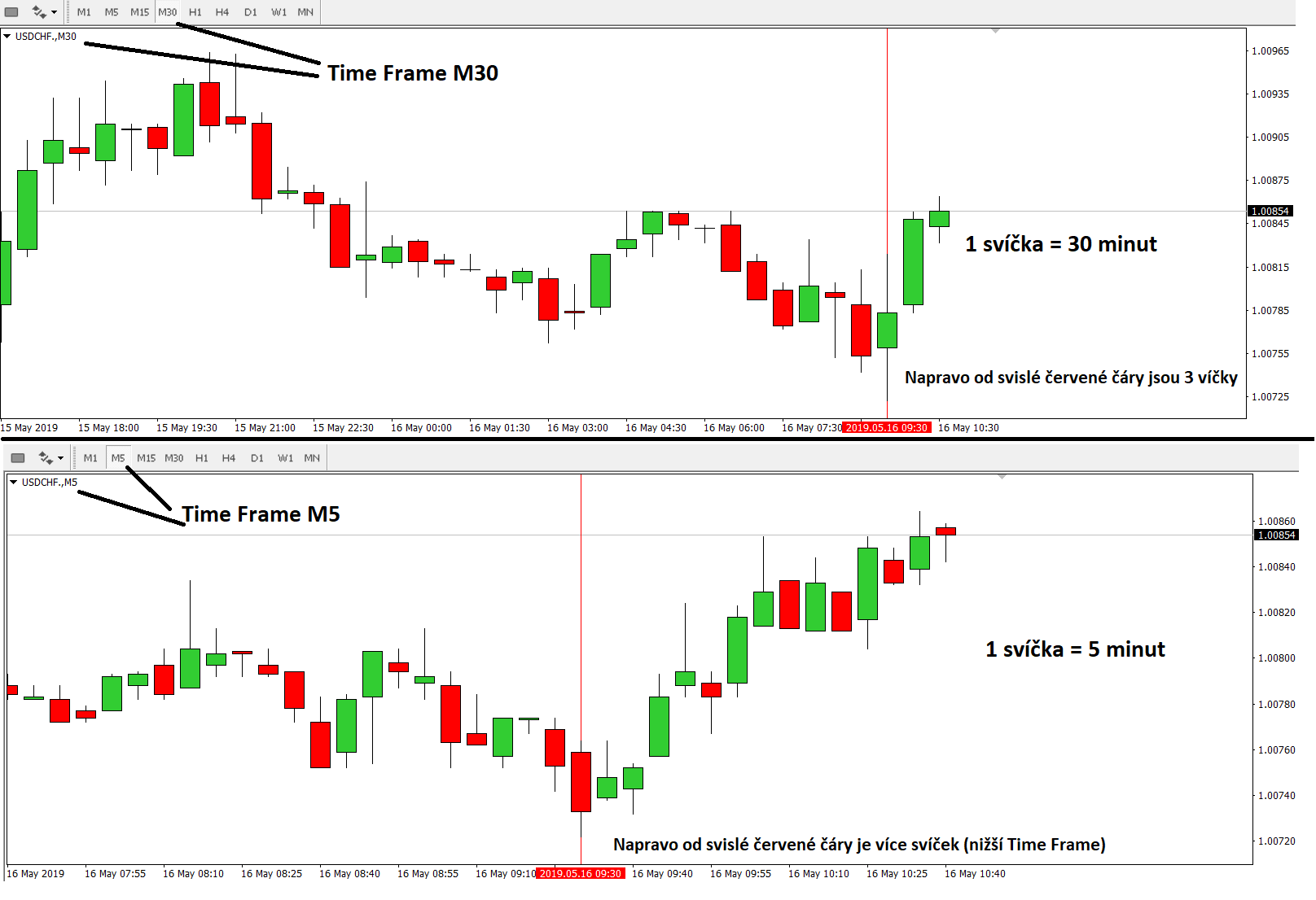 Časový rámec skrývající se v MT4 pod značkami: „M1, M5, M15, M30, H1, H4, D1, W1, MN“, kdy například M5 značí, že každá svíčka v grafu má časovou hodnotu 5 minut. Tři takové svíčky vedle sebe představují tedy 15 minut.