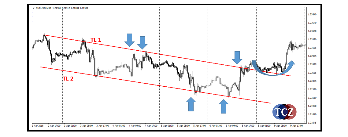 K vytvoření trendového kanálu se využívají trendové linie směřující stejným směrem a ohraničující tržní pohyb ze dvou stran.